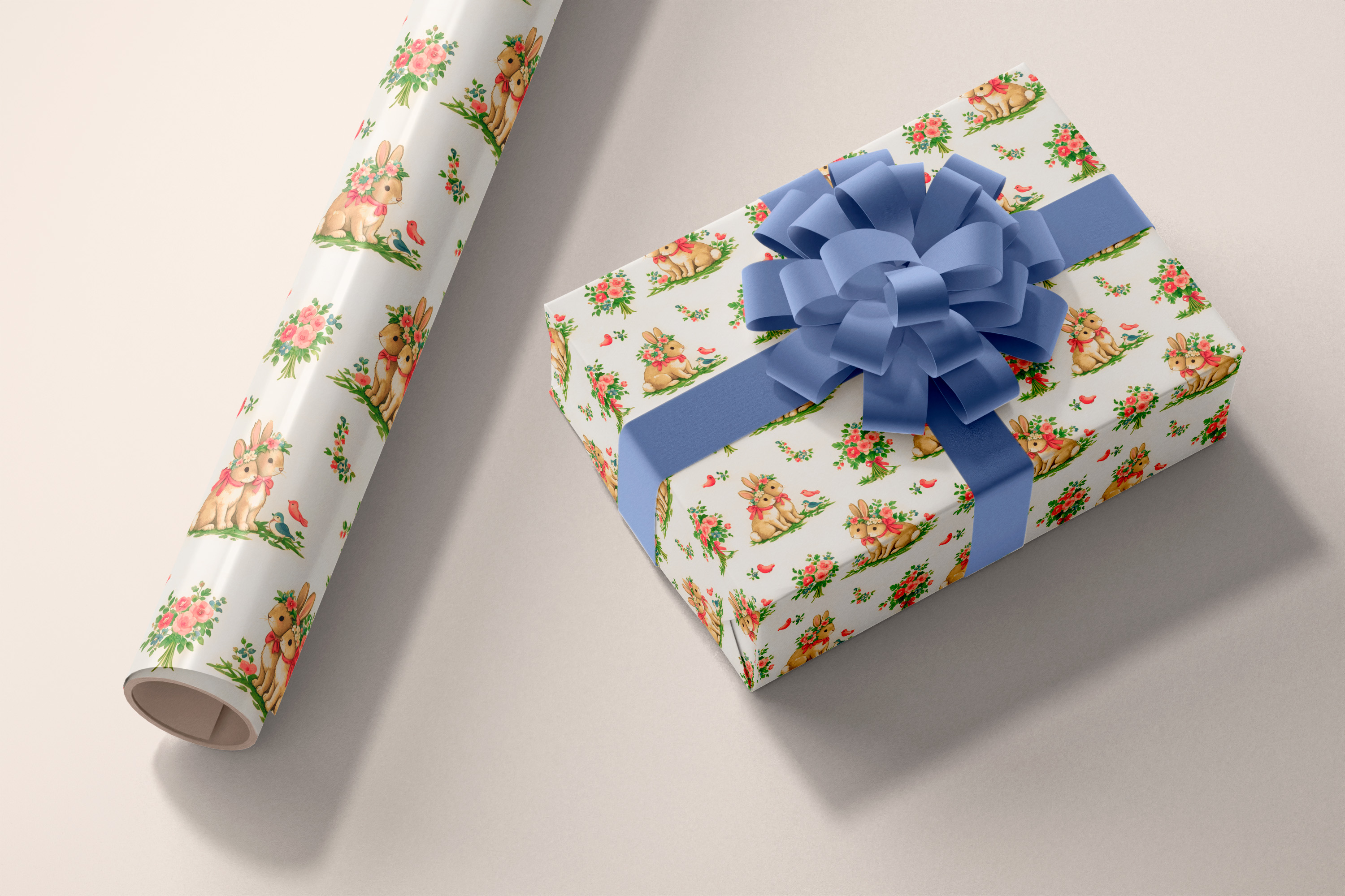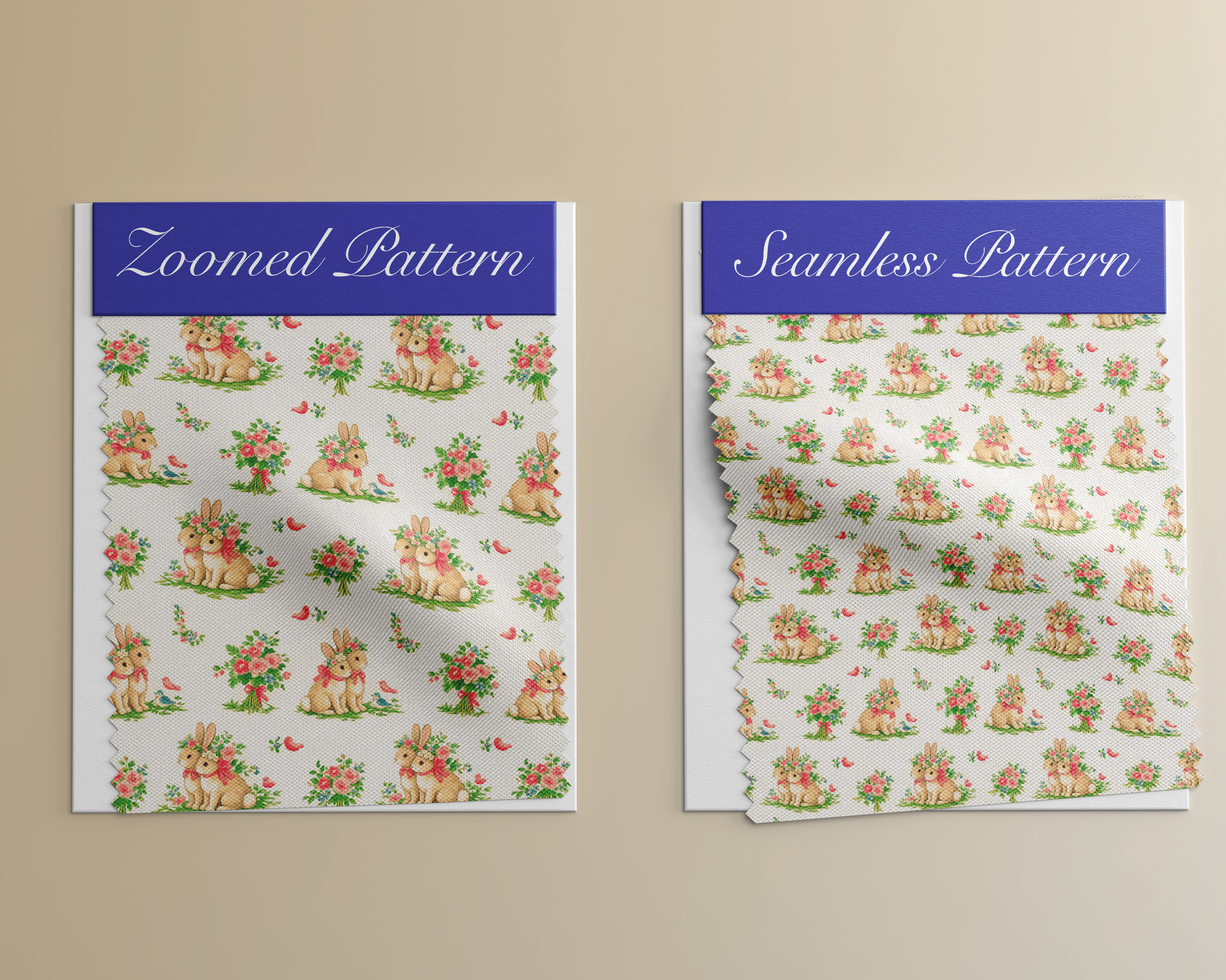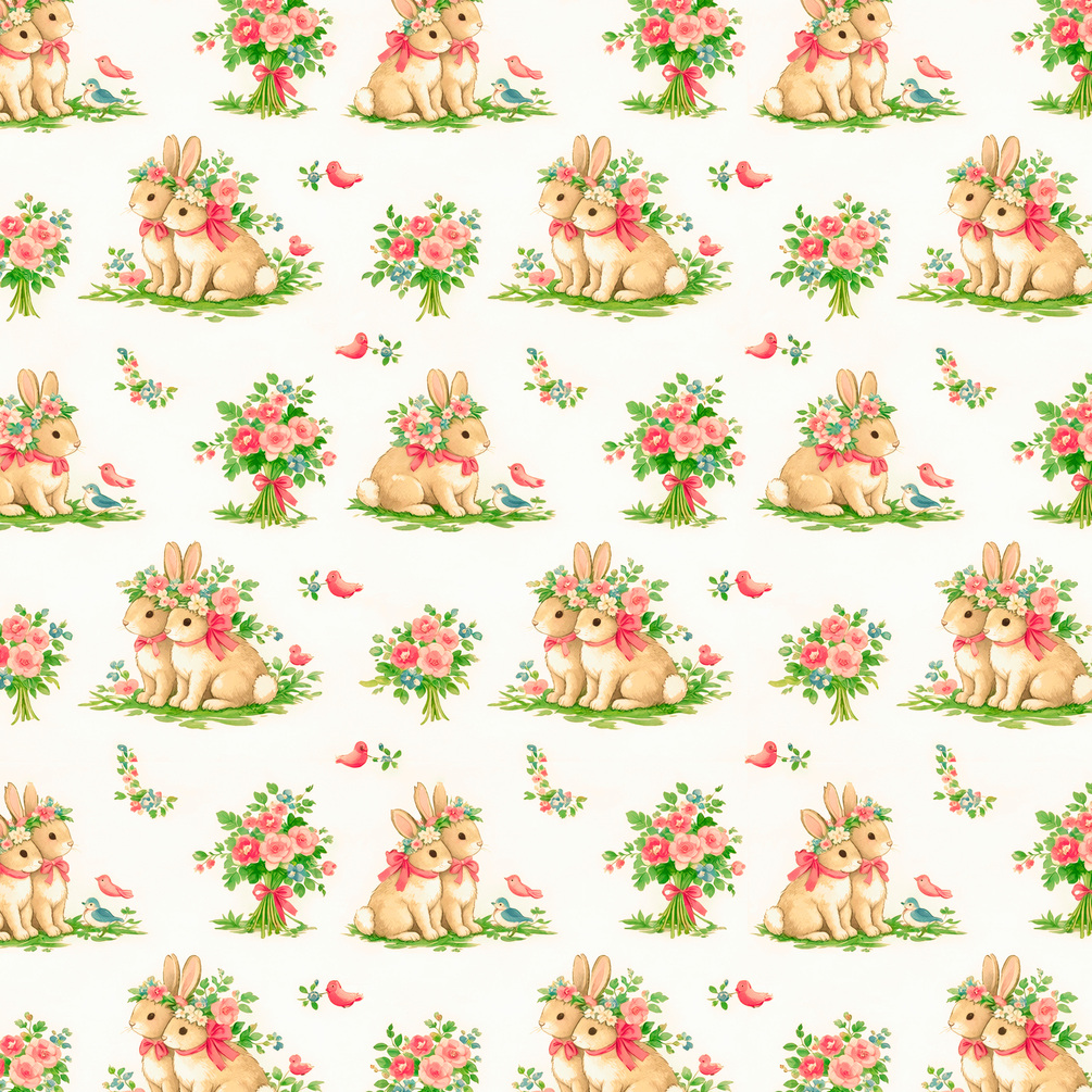 Watercolor Rabbits Floral Seamless Pattern Digital Paper – Cute Bow Rabbits Design with Vintage Flowers Fabric Pattern